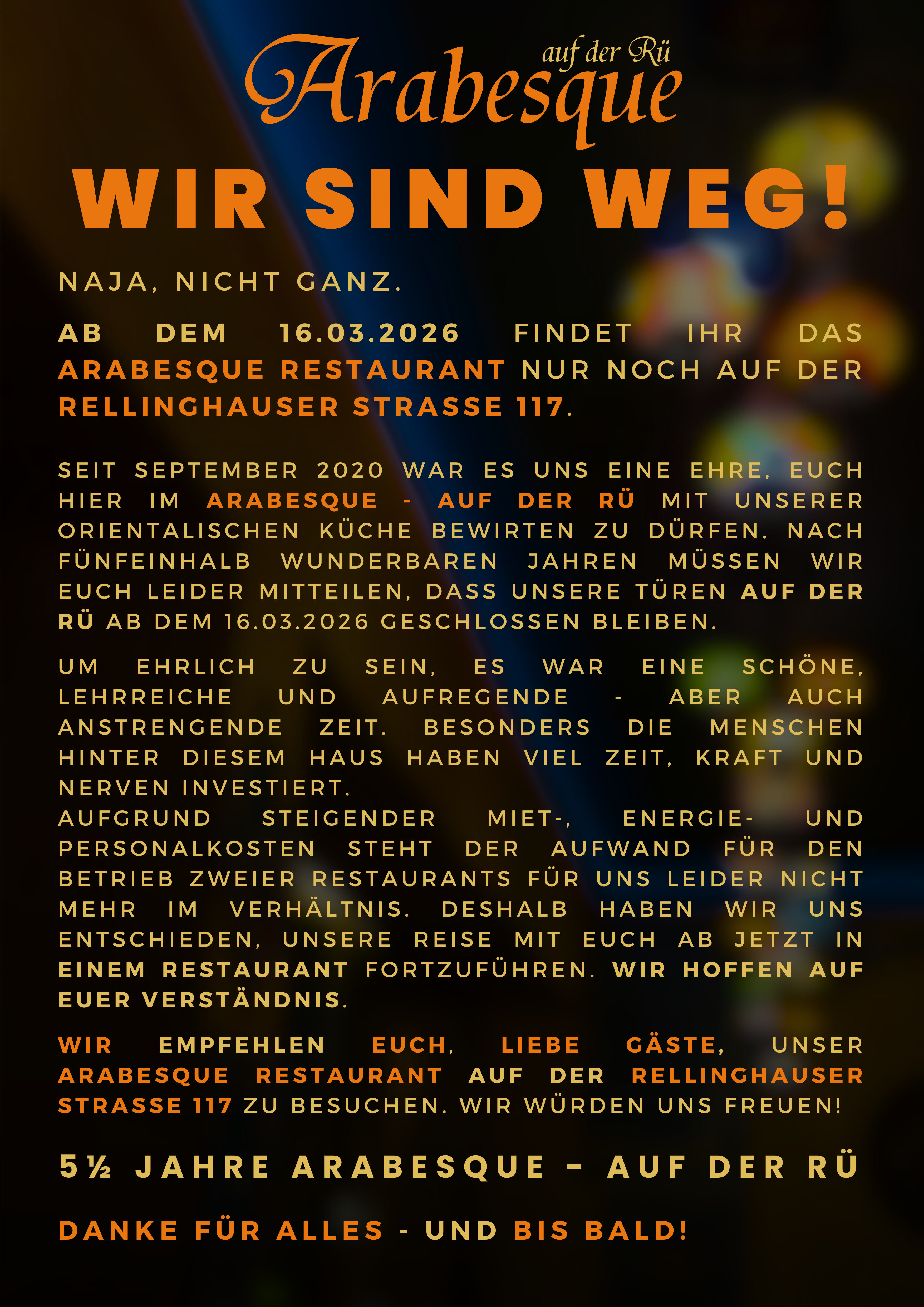 Seit September 2020 war es uns eine Ehre, euch hier im Arabesque – Auf der Rü mit unserer orientalischen Küche bewirten zu dürfen. Nach fünfeinhalb wunderbaren Jahren müssen wir euch leider mitteilen, dass unsere Türen auf der Rü ab dem 16.03.2026 geschlossen bleiben.